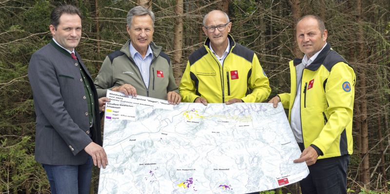 Unwetter verursachten allein im Juni 120.000 Kubikmeter Schadholz. BM Norbert Totschnig, LH Anton Mattle und LH-Stv. Josef Geisler machten sich vor Ort ein Bild vom Ausmaß der Schäden.