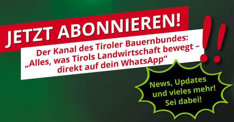 JETZT ABONNIEREN! Der Kanal des Tiroler Bauernbundes: „Alles, was Tirols Landwirtschaft bewegt – direkt auf dein WhatsApp“