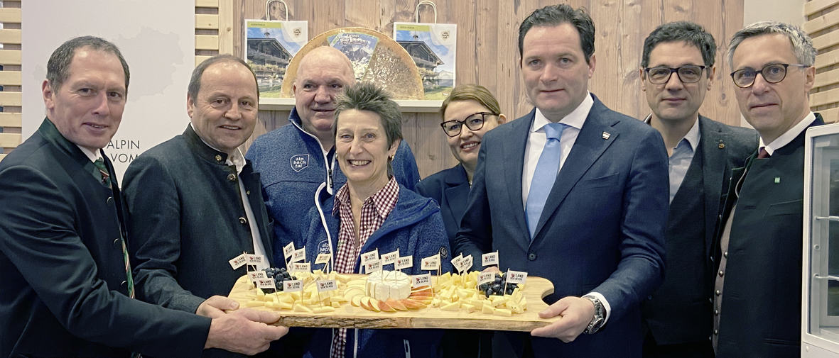 Vor der Alpbachtaler Heumilchkäserei (v. l.): LKÖ-Präsident Josef Moosbrugger, LHStv. Josef Geisler, Familie Kammerlander vom Pinzgerhof, AMA-Marketing-Chefin Christina Mutenthaler, BM Norbert Totschnig, Bauernbunddirektor Peter Raggl und Bauernbundpräsident Georg Strasser.