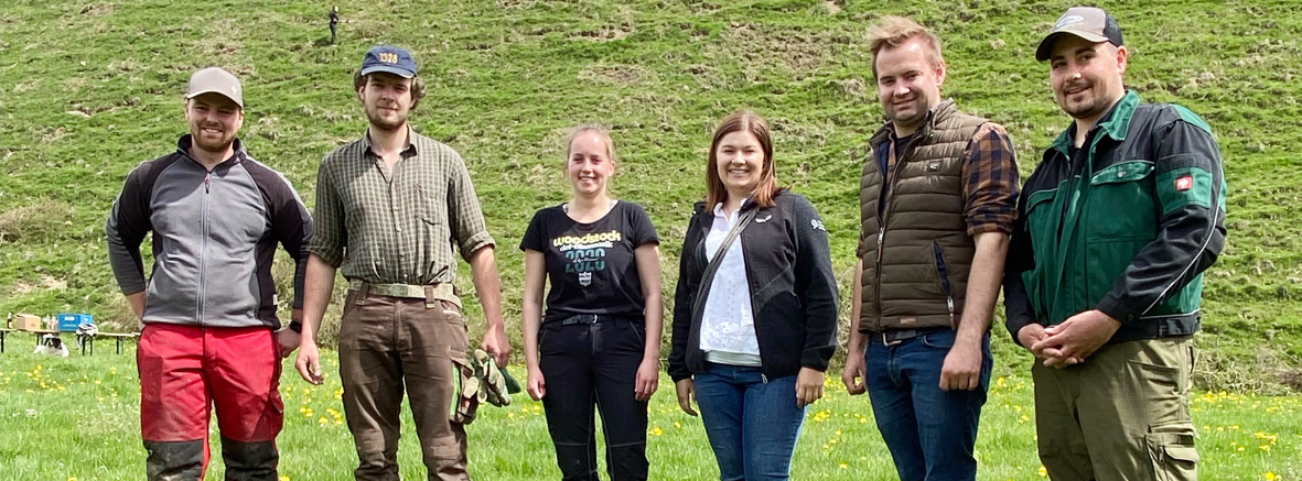 Die Landesobleute Dominik Traxl und Bettina Hechenberger (2. und 3. v. re.) zu Besuch bei den Ortsgruppen, hier im Bild Mitglieder der JB/LJ Grän, die eine Weideräumungsaktion durchführten. (Foto: TJB/LJ/JB/LJ Grän)