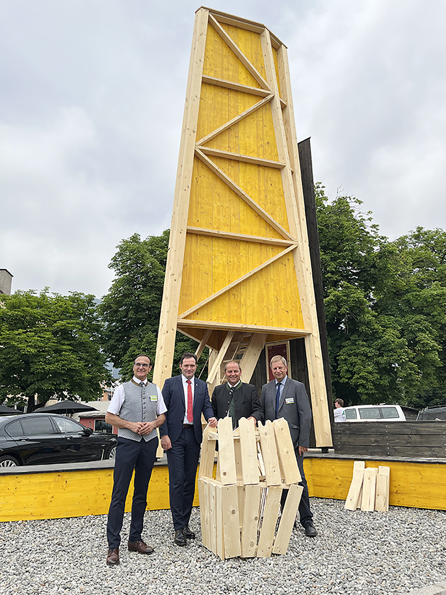 Als Symbol der Österreichischen Forsttagung wurde die TFBS Holztechnik Absam zusammen mit der Uni Innsbruck damit beauftragt, eine nachhaltige und elegante Konstruktion zu entwerfen. Herausgekommen ist die Holzskulptur „Zusammen Fallen Wir“ (siehe Bild).