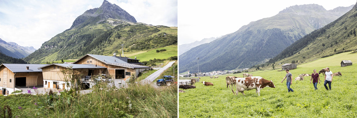 Foto links: Hof und Alm sind bei den Hubers praktisch eins. | Foto rechts: Die Hofweiden gehen in die Weiden der Faulbrunnalm über.