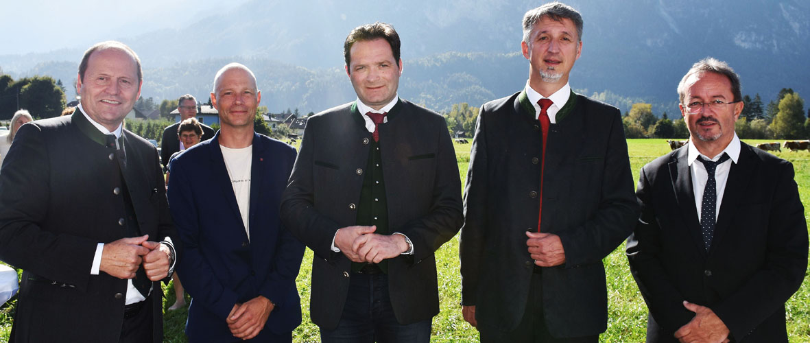 Bei der Eröffnung der Schulmetzgerei der LLA Lienz: Bauernbundobmann LH-Stv. Josef Geisler, Hannes Pargger – Hochbau Lienz, Bundesminister Norbert Totschnig, Markus Einhauer – Direktor der LLA Lienz und Gerhard Wastian – Vorstand der Abteilung Hochbau. (Foto: Land Tirol/Milicevic)
