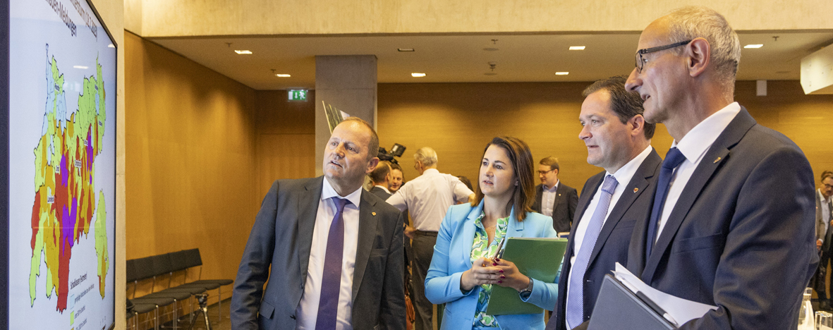 LH-Stv. Josef Geisler, LRin Astrid Mair, BM Norbert Totschnig und LH Anton Mattle beim ersten Forstgipfel Anfang August 2023. (Foto: Land Tirol/Die Fotografen)