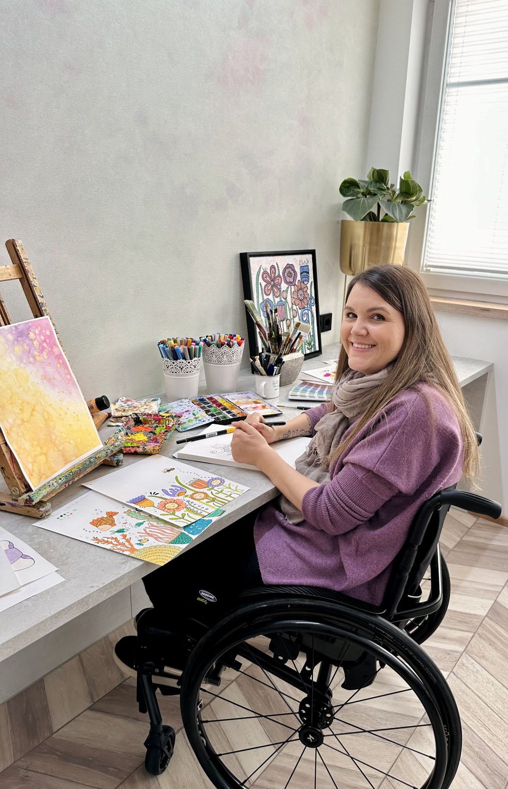 Jedes einzelne Werk der Unterländer Künstlerin ist im Prinzip ein kleines Wunder. Vor 15 Jahren hatte Tina Hötzendorfer nämlich einen schweren Unfall. Bei einem Sturz mit ihrem Snowboard erlitt sie einen Trümmerbruch des sechsten Halswirbels und erhielt die erschütternde Diagnose „Querschnittlähmung". „Nach meinem Unfall fiel ich in ein tiefes, dunkles Loch. Ich hatte keine Perspektive mehr", erinnert sich Hötzendorfer. Vor ihr lag ein Leben im Rollstuhl, doch die junge Frau gab nicht auf. Es war ein langer Prozess, der zu einem großen Teil auch in ihrem Kopf stattfand. „Es hat Jahre gedauert, um für mich herauszufinden, dass ein Leben mit einer Behinderung nicht im Dunkeln stattfindet, so wie es leider immer noch in großen Teilen des gesellschaftlichen Denkens verankert ist", erzählt sie.