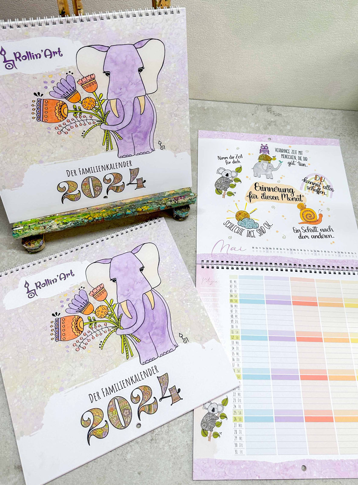 Tina Hötzendorfer hat im Malen ihre Berufung gefunden und zaubert wunderbare Werke. Natürlich findet man den Elefanten auch am Jahresplaner 2024. (Fotos: Privat)