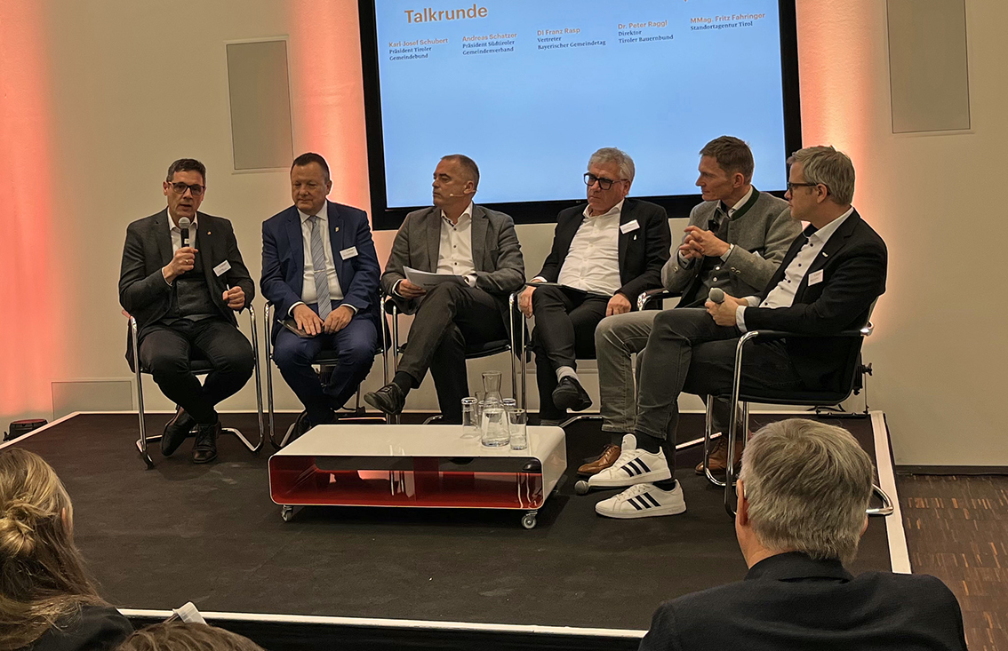 In der abschließenden Talkrunde diskutierten Karl-Josef Schubert (Präsident Tiroler Gemeindeverband), Andreas Schatzer (Präsident Südtiroler Gemeindenverband), Franz Rasp (Bayerischer Gemeindetag), Fritz Fahringer (Standortagentur Tirol) und Peter Raggl (Direktor Tiroler Bauernbund) über die Chancen und Risiken der KI im kommunalen Sektor. Als Grundlage für die breite Anwendung von KI muss in Tirol zuerst die Hardware auf Vordermann gebracht werden, also die flächendeckende Implementierung von 5G sowie der Ausbau des Glasfasernetzes.