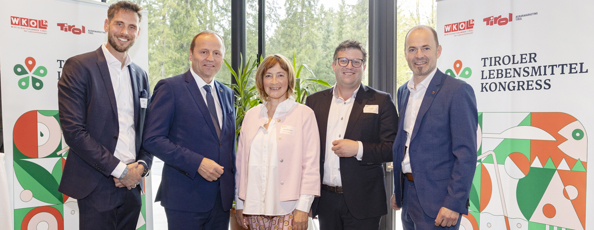 Matthias Pöschl – Geschäftsführer Agrarmarketing Tirol, LH-Stv. Josef Geisler, Patricia Niederwieser – Obmann-Stvin Sparte Handel WK, Stefan Mair – Obmann Landesgremium Tiroler Lebensmittelhandel WK und NR Josef Hechenberger – Präsident LK Tirol (Foto: WK Tirol/Die Fotografen)