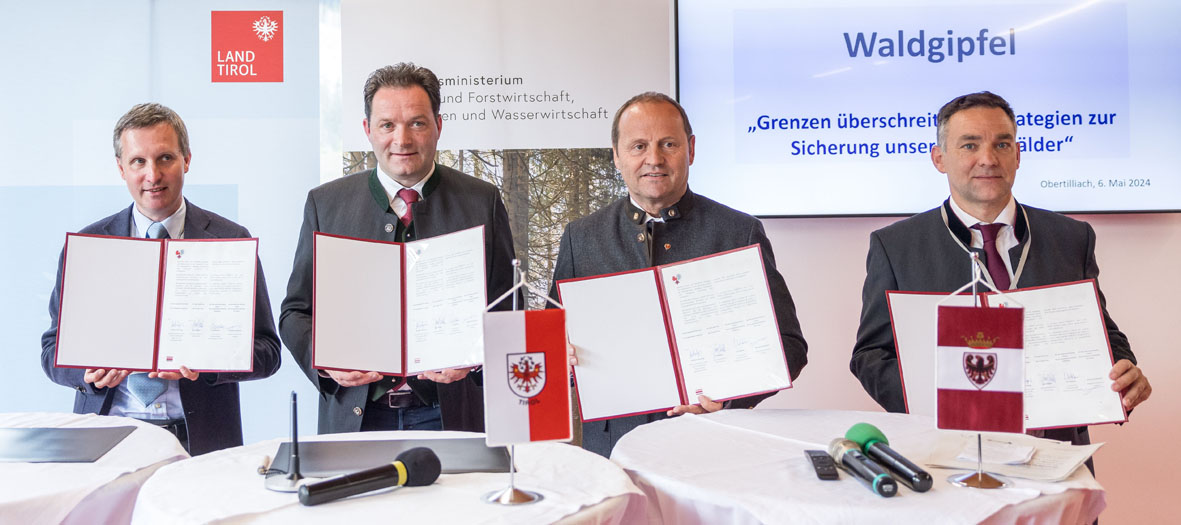 Ein klares Bekenntnis zum Wald mit all seinen Funktionen sowie zu einer aktiven Waldbewirtschaftung gerade in Zeiten der Klimaveränderungen haben Bundeminister Norbert Totschnig und die Europaregion Tirol-Südtirol-Trentino, vertreten durch LH-Stv. Josef Geisler und seinen Südtiroler Amtskollegen LR Luis Walcher vergangene Woche in Osttirol im Rahmen der Euregio-Fortschutztagung und des Österreichischen Walddialogs abgegeben. Zur Stärkung der Bergwälder will man in Zukunft noch enger über die Grenzen hinweg zusammenarbeiten.