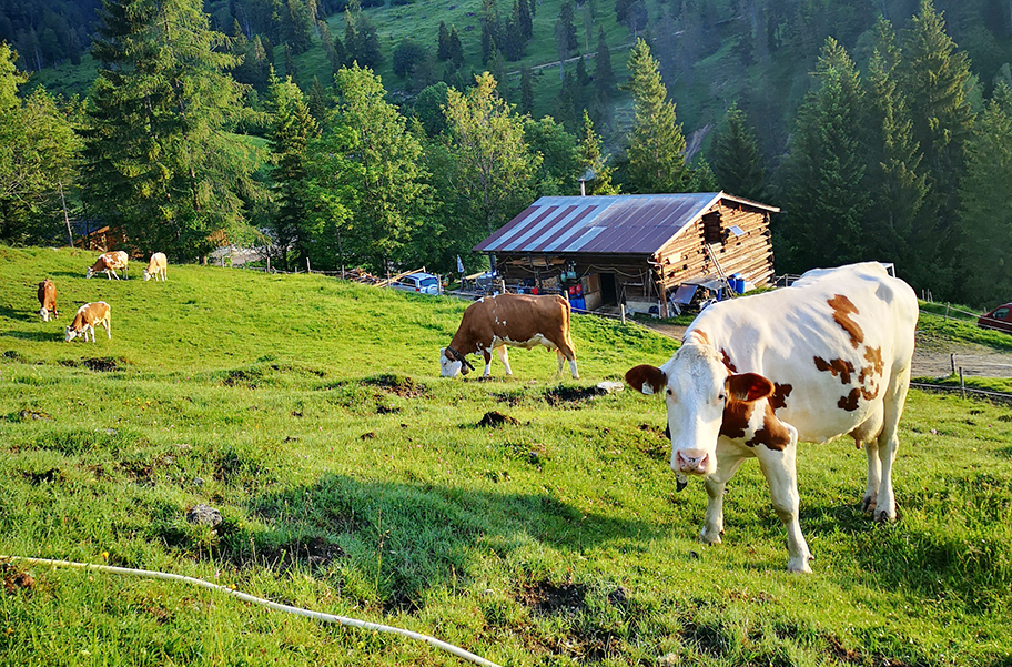 Auch Marias Mann Christian, ein Landwirtschaftsexperte, bestärkte sie in ihrem Plan und sah, genau wie sie, die Alm als „Familienlebensprojekt“. Er schenkte ihr sogar einmal zu Weihnachten einen Almwirtschaftskurs. „Diesen konnte ich dann leider aus zeitlichen Gründen nicht einlösen, deshalb war ich wirklich ein blanker Almneuling, als ich mich um die Stelle auf der Baumbachalm bewarb. Wir haben ja selber keinen Hof zuhause und bis dahin hatte ich noch nie eine Kuh gemolken. Als ich dann aber im Stall der Atzls die Kühe sah, merkte ich gleich, dass es ruhige, sanftmütige Tiere sind und ich dachte, ich sehe mich darüber aus.“