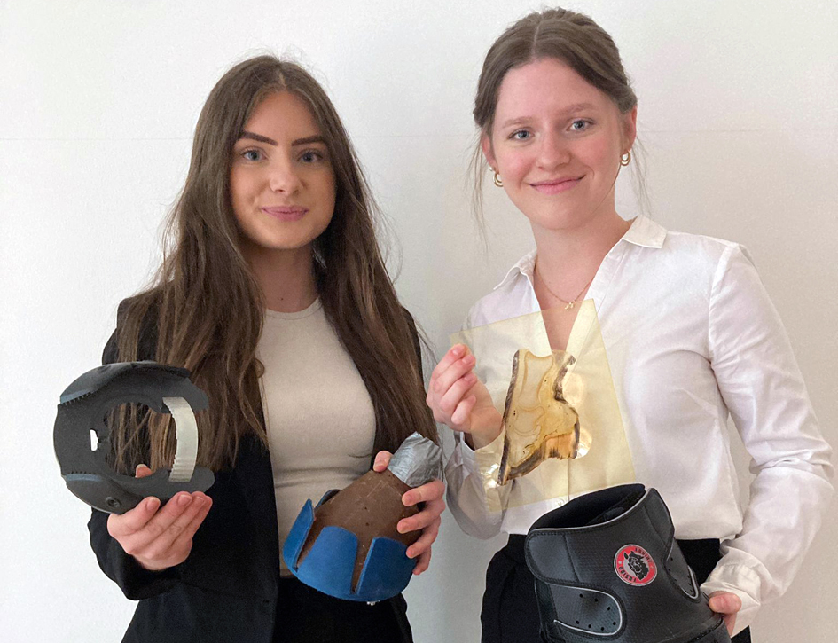Theresa Schuchter (links) und Julia Sevignani (rechts) mit Hufschuhe, Klebebeschläge und einem Hufquerschnitt.