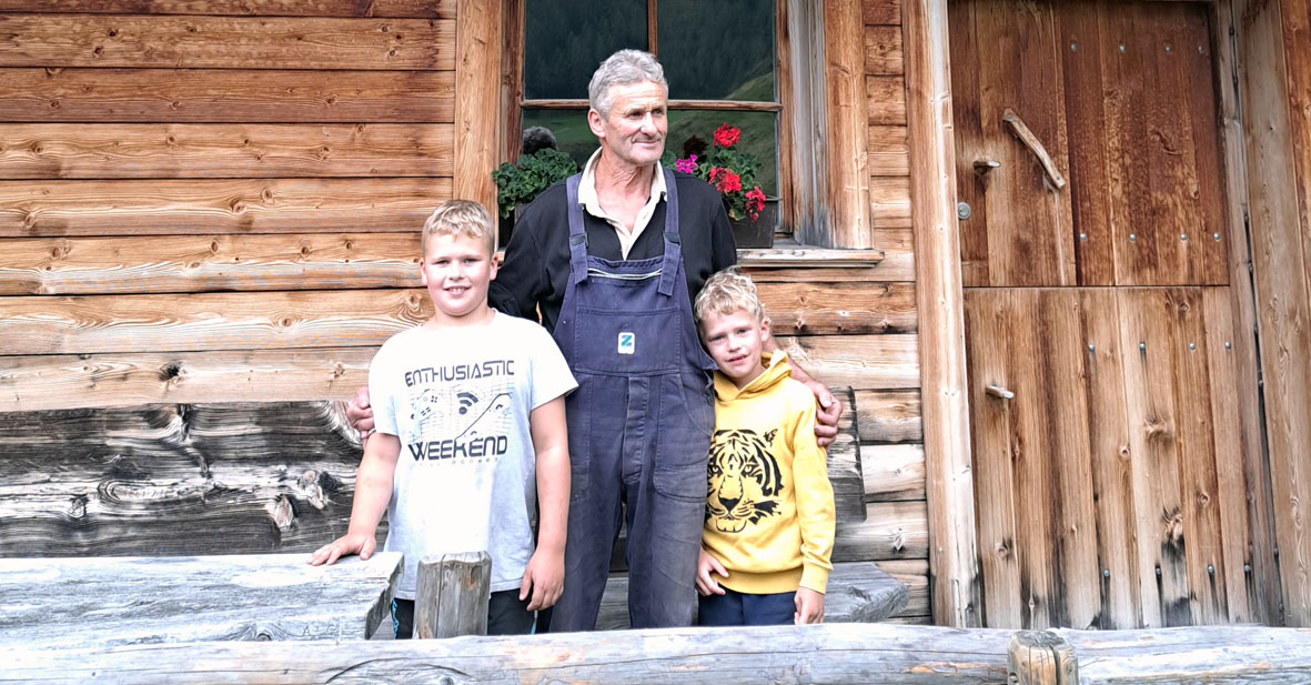 Farmkehralm: Almbauer Alois Larch mit seinen Enkeln Hannes & Lukas. (Foto: Familie Larch)