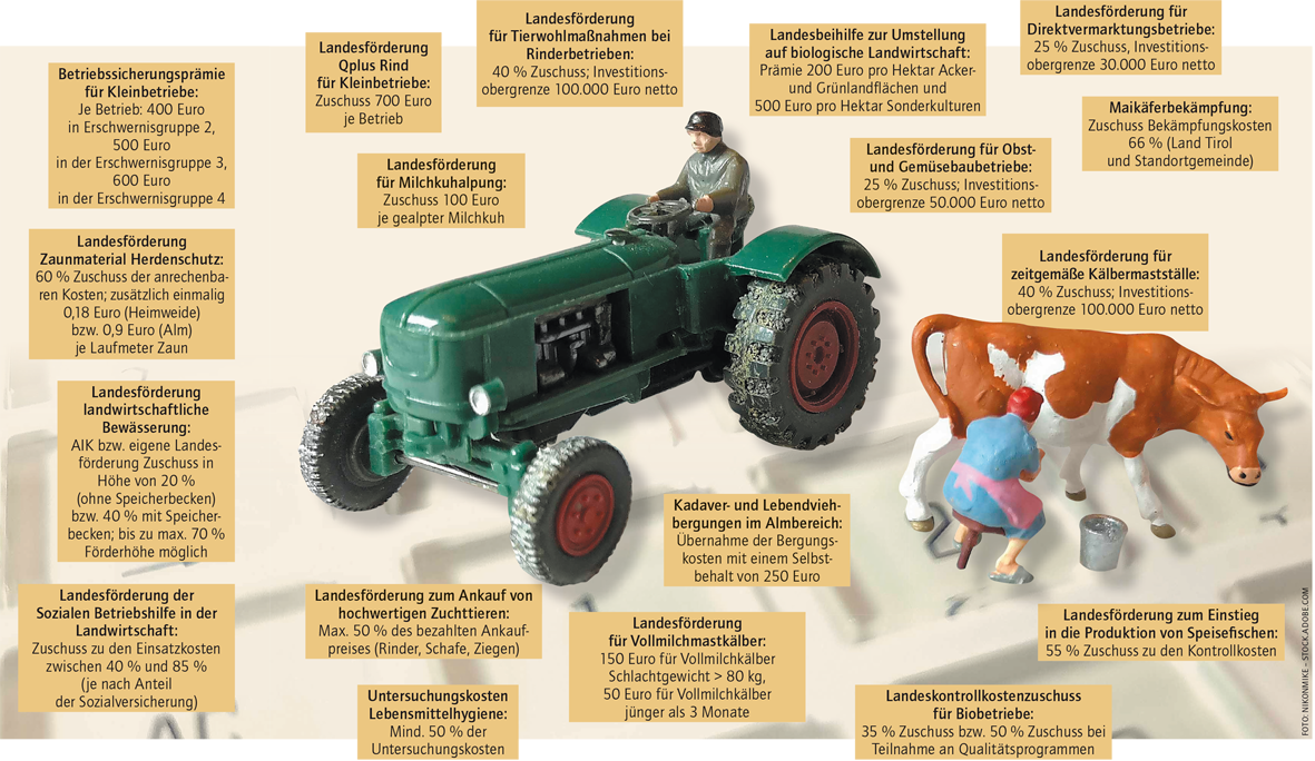 Die Landesförderung für Rinderbetriebe zur Errichtung eines Auslaufes sowie Stallumbauten zu Laufställen beinhaltet einen 40-prozentigen Zuschuss bei einer Investitionsobergrenze von 100.000 Euro. Insgesamt veranschlagt die Förderung zwei Millionen Euro jährlich. Bei Teilnahme am Kälberprojekt der Rinderzucht Tirol steht landwirtschaftlichen Betrieben auch die Landesförderung für Kälberställe mit demselben Zweck offen. Die Förderung für die Errichtung von zeitgemäßen Kälbermastställen beträgt ebenso 40 Prozent Zuschuss bei einer Investitionsobergrenze von 100.000 Euro.
