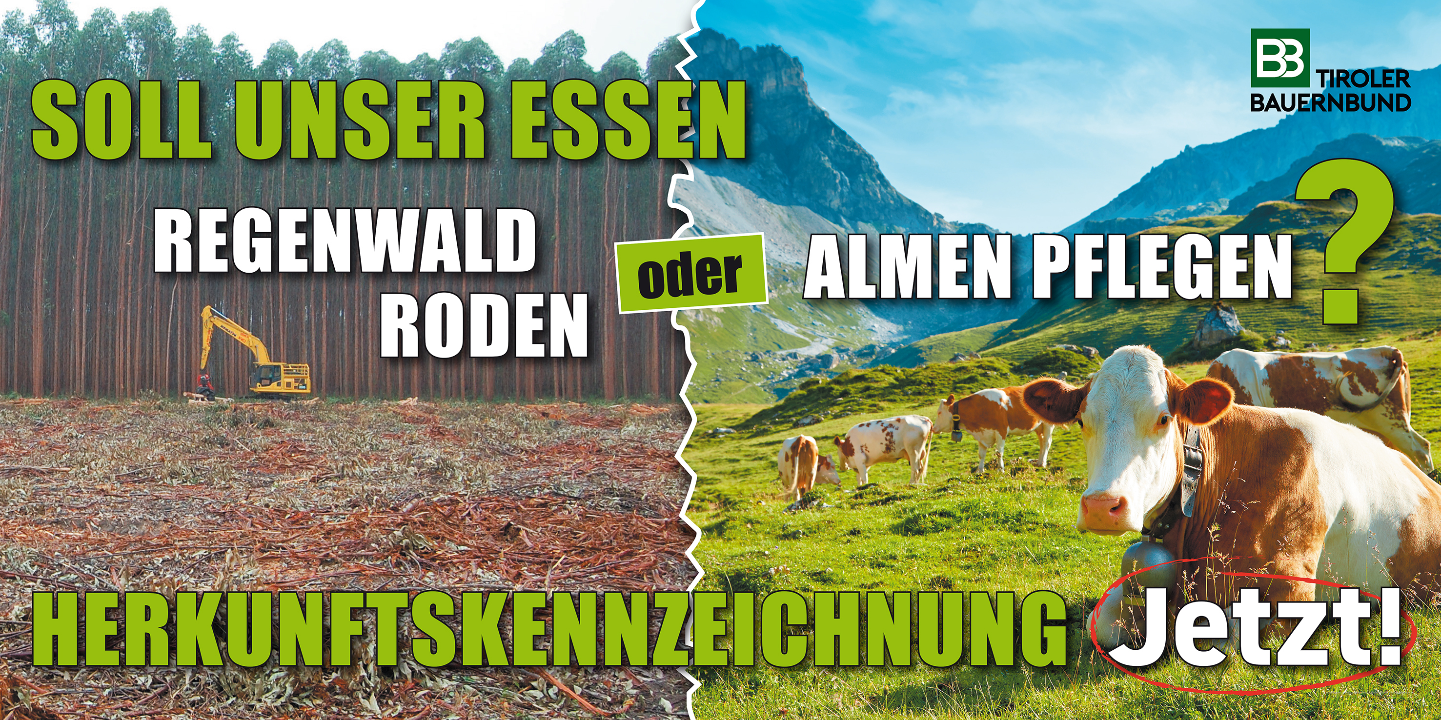 Der Tiroler Bauernbund bekräftigt seine Forderung mit einer neuen Plakatwelle. In allen Bezirken werden an ausgewählten und stark frequentierten Plätzen 3 x 1,5 m große Transparente aufgehängt, die zur breiten Bewusstseinsbildung beitragen sollen.