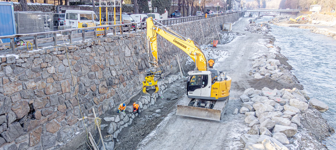 Bauarbeiten an der Isel in Lienz: Im Rahmen des Hochwasserschutzprojektes für ein 100-jährliches Ereignis wird auch eine umfassende Sanierung der Ufermauern vorgenommen. (Foto: Brunner Images)