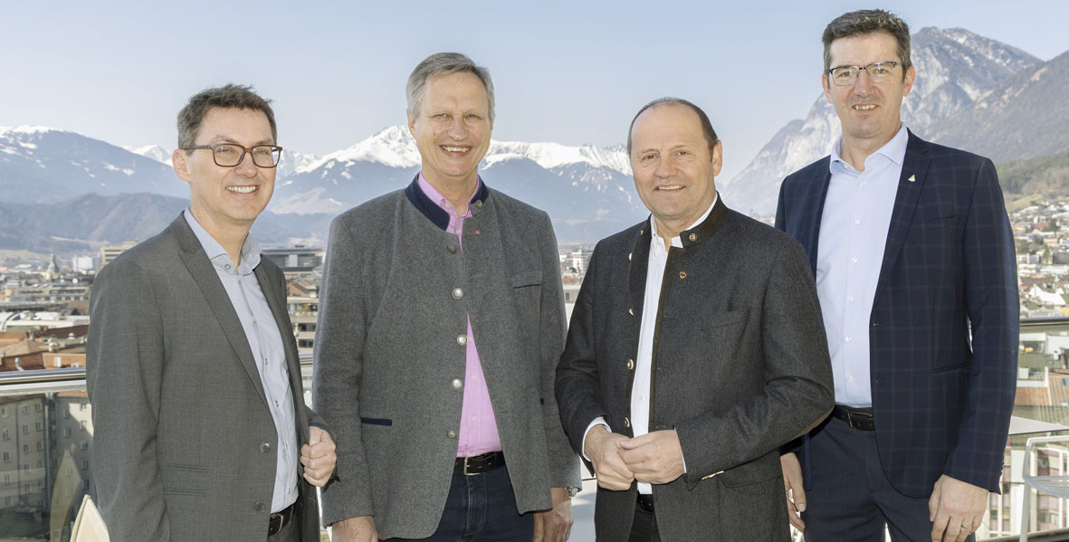Präsentierten die Maßnahmen zum Schutz vor Naturgefahren in Tirol 2025: Markus Federspiel – Vorstand Abteilung Wasserwirtschaft, Landesforstdirektor Josef Fuchs, LH-Stv. Josef Geisler und Gebhard Walter – Leiter Sektion Tirol der WLV. (Foto: Die Fotografen)