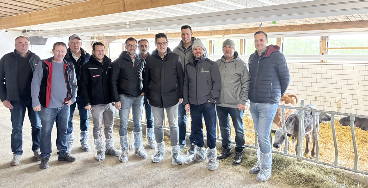 Die Projektbeteiligten und Unterstützer mit Bauer Hannes Post (2. v. l.) bei der Besichtigung des Stallumbaus in Mieming. (Anm. d. Redaktion: Der Stallbesuch erfolgte vor Empfehlung der MKS-Vorsichtsmaßnahmen.)