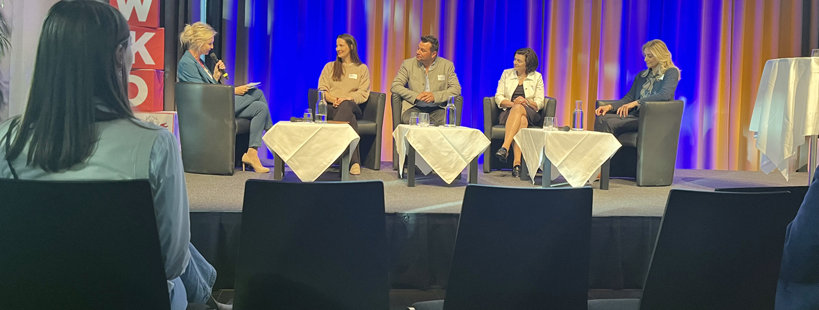 Bei der Podiumsdiskussion (v. r.): Klara Neurauter (Neurauter*frisch), Obstbäuerin und Lebensmitteltechnologin Regina Norz, Christian Kröll (Erlebnissennerei Zillertal) und Wissenschaftlerin Theresa Mitterer-Leitner (MCI). (Foto: BauernZeitung)