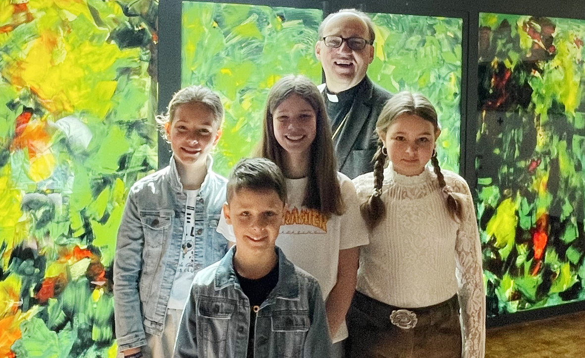 Bischof Hermann Glettler mit Ministranten bei der Einweihung der Glasfenster von Herbert Brandl in der Pfarrkirche St. Johann im Walde, April 2024. (Foto: Arno Cincelli)