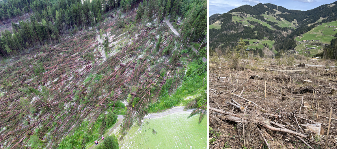Nach dem Hagelsturm: 4.000 Festmeter Schadholz verzeichnete Michael Weißbacher. (Foto: Holzerbauer) | Der Wald wurde mit insgesamt 7.000 Fichten, Lärchen, Weißtannen, Schwarzerlen und Buchen wieder aufgeforstet. (Foto: BauernZeitung)
