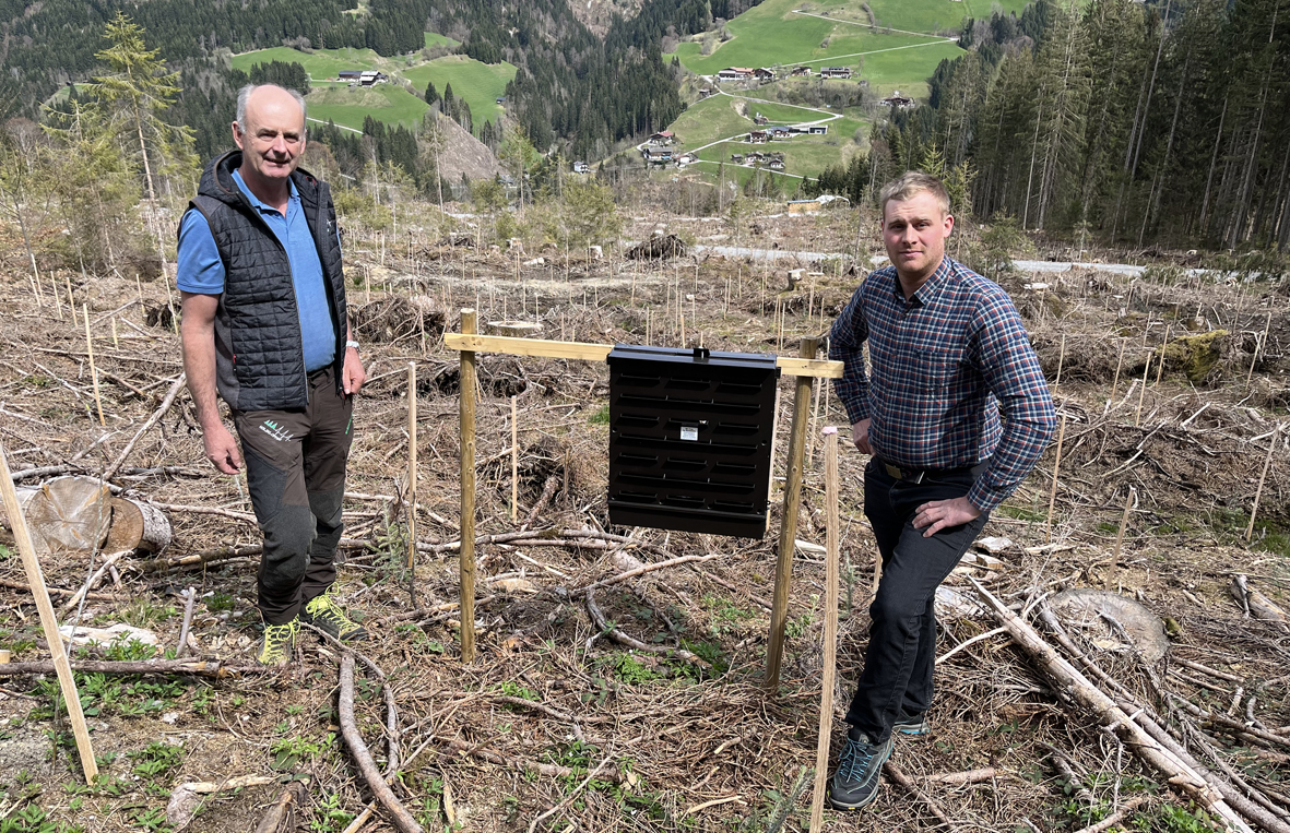 Josef Fuchs und Michael Weißbacher beim Lokalaugenschein. An der Käfer-Monitoring-Falle kann man die Borkenkäfer-Gefahr ablesen. (Foto: BauernZeitung)