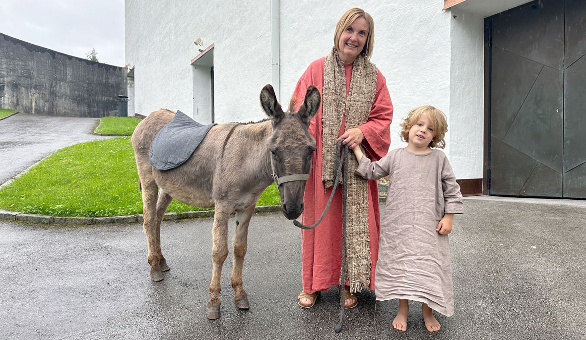 Auch Silvia Schwaiger vom „Riedlhof", die langjährige Ortsbäuerin von Erl, ist seit ihrer Kindheit mit Begeisterung bei den Passionsspielen dabei. Heuer spielt sie mit Enkel Sebastian im Volk mit. „Man ist ein kleiner Teil von etwas ganz Großem" fasst sie ihre Begeisterung zusammen. Eine im wahrsten Sinne des Wortes tragende Rolle bei den Passionsspielen hat ihr Esel Leo, der heuer bereits die dritte Saison mit dabei ist.