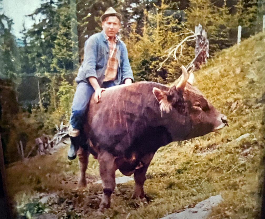 Josef Stöger verbrachte mit 16 Jahren seinen ersten Sommer als Hirte im Wattental – zwei Jahre später übernahm er erstmals die verantwortungsvolle Aufgabe des Stierhirten. Sieben Sommer lang betreute er rund 60 Stiere aus ganz Tirol. Noch heute ist er dankbar, dass diese Zeit ohne ernsthafte Zwischenfälle verlief: „Hin und wieder versuchten manche, die Weiden der Stiere zu queren. Die bekamen dann aber schnelle Haxn und bei der Flucht gab es dann auch schon mal einen Knochenbruch“, erinnert sich Josef schmunzelnd. Er selbst begegnete den Tieren stets mit Respekt und viel Gespür. Nur selten packte ihn der Übermut und er erlaubte sich einen Scherz – dann setzte er sich kurz auf den Rücken eines Stiers.