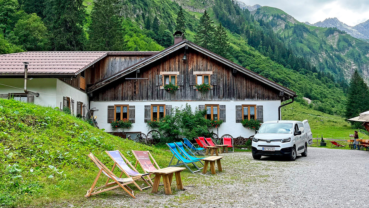 Regionalität ist den Gastwirten wichtig – und wird so gut wie möglich umgesetzt, erklärt Karl-Heinz. Die almtypische Speisekarte, von Jausen über Knödel bis hin zu Kuchen, lässt sich mit heimischen Produkten abdecken. Das Gastro-Team besteht aus fünf Vollzeitkräften, die Karl-Heinz und Elfriede von Dienstag bis Sonntag unterstützen. „Vor allem Pensionisten besuchen uns gerne, da der Weg perfekt für Fahrräder geeignet ist. Die Alm liegt am Ende von Hinterhornbach – wir sind sozusagen die Endstation der Radtour", meint Karl-Heinz.