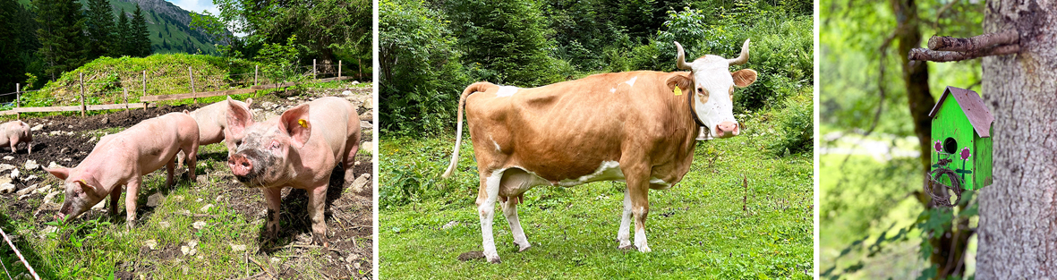 Acht Almschweine werden zur Verwertung der Molke gehalten. | „Golden Girl" Pia genießt die 30 Hektar Weidefläche. | Mit viel Liebe zum Detail kümmert sich Elfriede Kröll um die Deko.