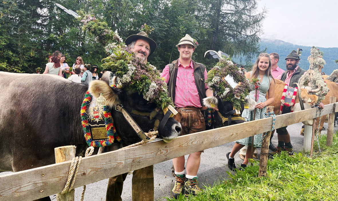 Aus der Ferne hört man bereits die ersten Kuhglocken. Die Goaßlschnalzer lassen ihre Peitschen schnellen, in Tracht gekleidete Kinder aus dem Dorf tragen das Schild mit der Aufschrift „Der Summer ist aus, i mueß obi ins Tal" vor sich her. Alle, die sich am Dorfplatz versammelt haben, möchten die Almtiere bewundern, die ihren Weg in den heimischen Stall antreten. Etwas oberhalb des Platzes bereiten Klaus Schrott, Agrarobmann Tanzalpe Jerzens, und über 40 Helferinnen und Helfer die Kühe auf ihren großen Auftritt vor. Es wird geputzt, der prächtige Kopfschmuck fixiert, die Kuhglocken mit kunstvoll bestickten Riemen nochmals überprüft.