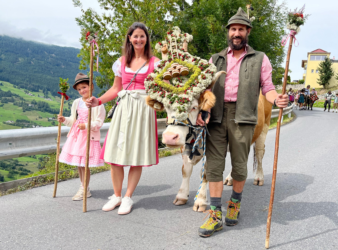 V. r.: Klaus Schrott, Hirte auf der Kalbenalm und Agrarobmann der Tanzalpe Jerzens, beim Almabtrieb mit seiner Frau Helga und der fleißigen Treiberin Sophia. Kuh Fini durfte einen besonderen Kopfschmuck tragen, denn sie war die produktivste Milchkuh.