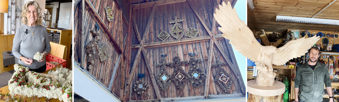 Seit 30 Jahren bindet Waltraud Schrott den Kopfschmuck mit Material von der Alm. Am Stadel des Bauernhaus Schrott sind die Kränze der vergangenen Jahre zu sehen. Klaus Schrott schnitzt am liebsten Tierskulpturen.