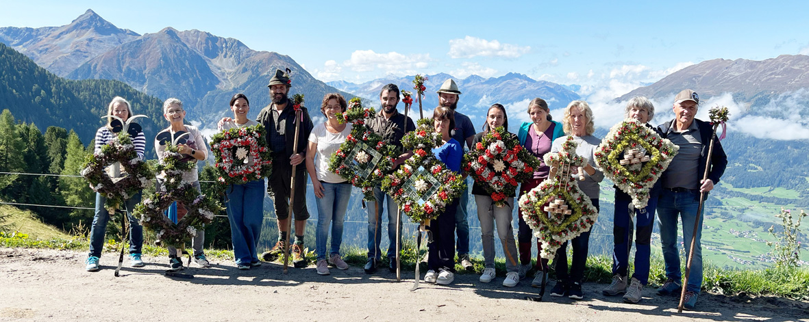 Hinter den Kulissen des Almabtriebs sind viele helfende Hände nötig. Bereits am Donnerstag trafen sich die Jerzener Bauernfamilien auf der Tanzalpe, um den Viehschmuck für den Abtrieb vorzubereiten. Das Binden der Kränze ist großteils Frauensache, die Männer sammeln die Naturmaterialien im Almgebiet und schmücken die Hirtenstecken. „Den gibt man als guter Hirte nur ungern aus der Hand – ich nehme meinen manchmal sogar mit ins Bett", schmunzelt Klaus. Selbst der Hut wird geschmückt, und auch die Hirten selbst putzen sich für den großen Tag heraus.