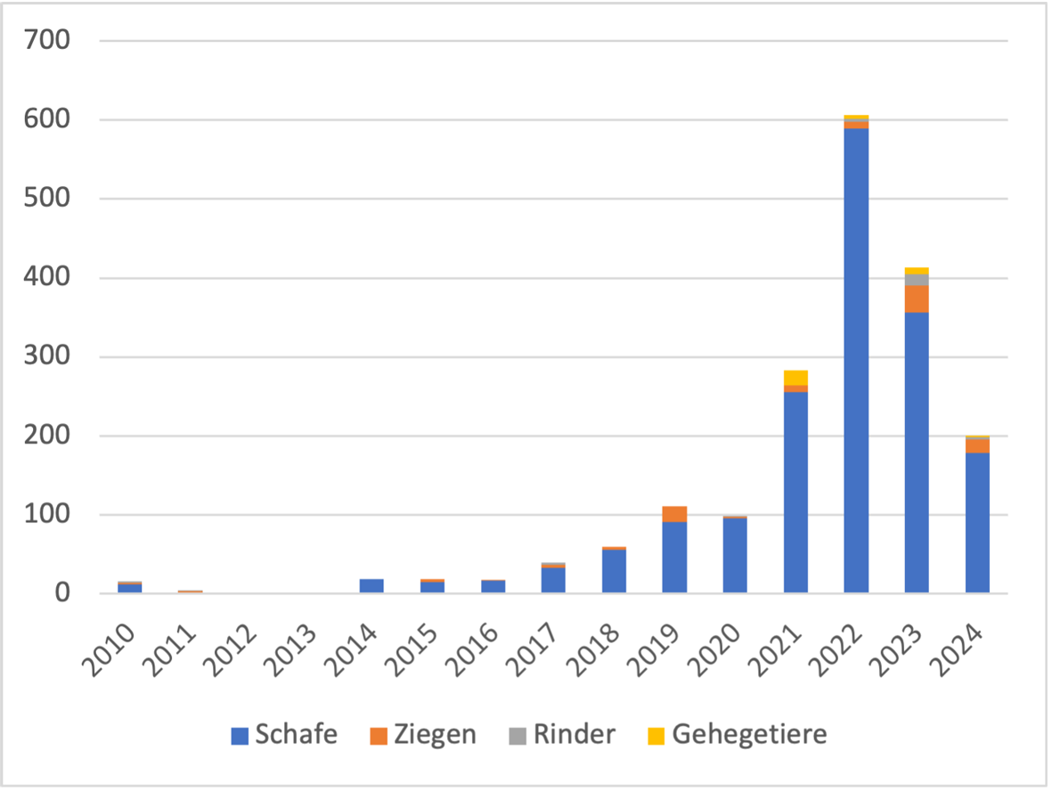 Im Jahr 2024 fielen knapp 200 Weidetiere Wölfen zum Opfer; in den Jahren zuvor lag die Zahl sogar bei über 400 bzw. mehr als 600 Tieren.